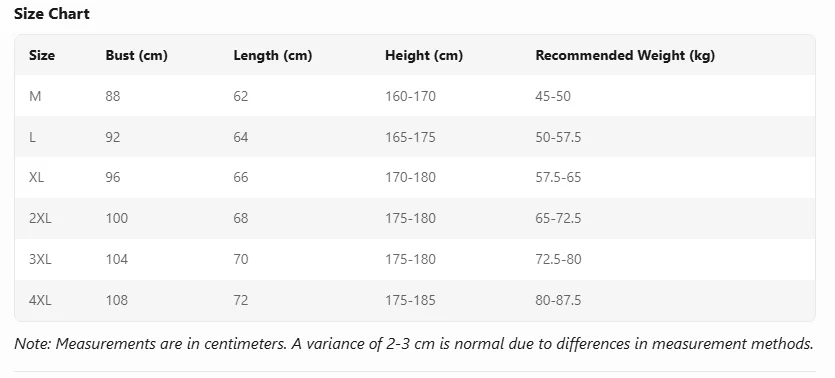 size_info: {"sizeInfoList":[{"length":{"cm":"88","inch":"34.65"},"size":"M - fits 45-50kg","vid":-1},{"length":{"cm":"92","inch":"36.22"},"size":"L - fits 50-57kg","vid":-2},{"length":{"cm":"96","inch":"37.80"},"size":"XL - fits 57-65kg","vid":-3},{"length":{"cm":"100","inch":"39.37"},"size":"XXL - fits 65-72kg","vid":-4},{"length":{"cm":"104","inch":"40.94"},"size":"3XL - fits 72-80kg","vid":-5},{"length":{"cm":"108","inch":"42.52"},"size":"4XL - fits 80-88kg","vid":-6}]}