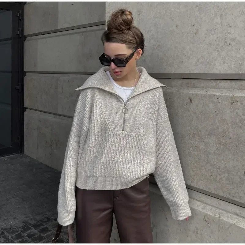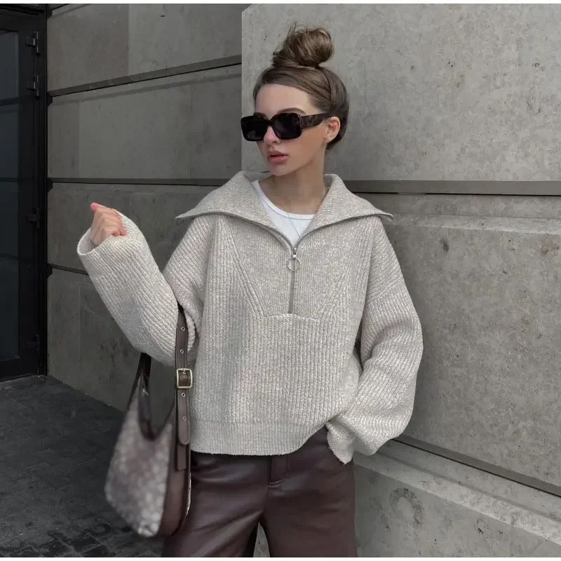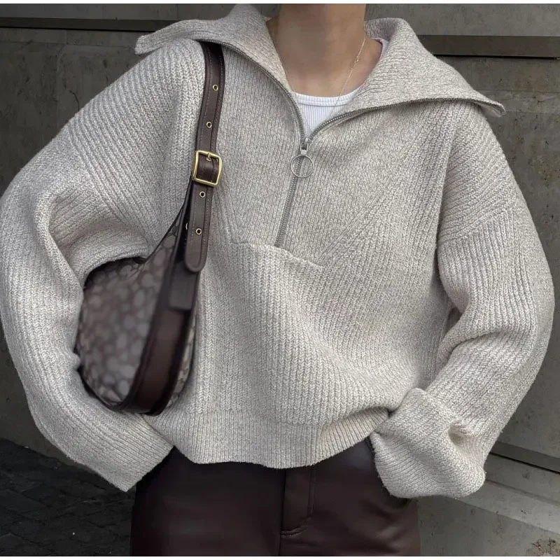 Casual Lapel Women Solid Sweater Loose Simple Zipper Long Sleeve Female Pullover 2025 Autumn Winter Lady All-match Simple Jumper