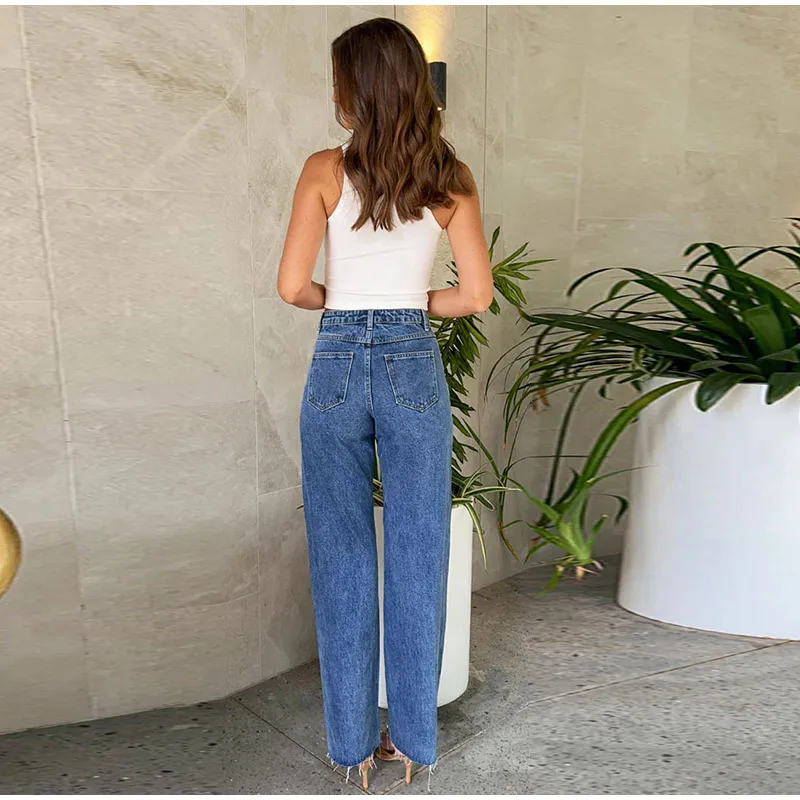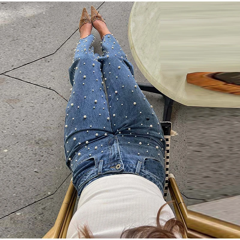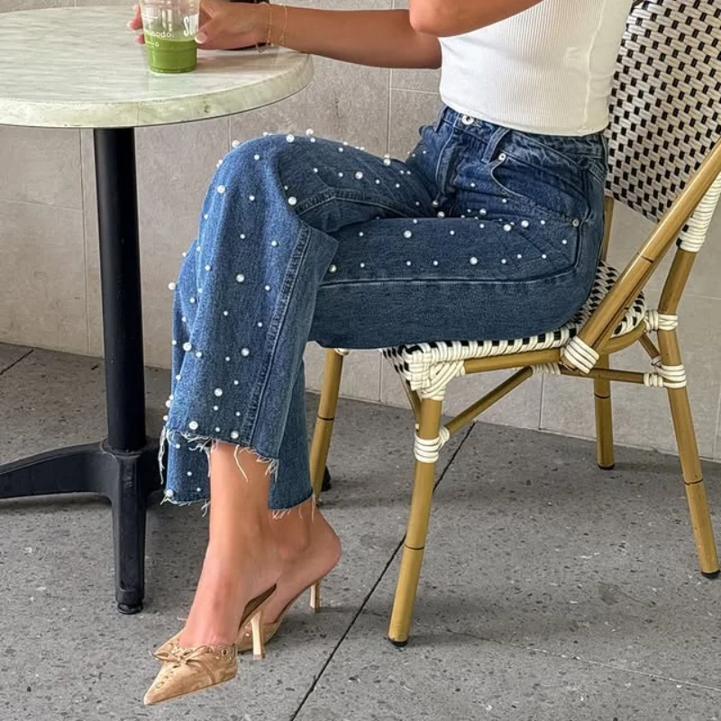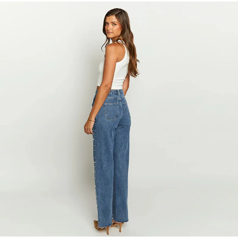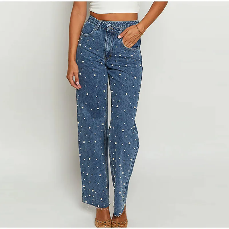 Fashion Full Pearl High Street Woman Jeans Crossed Waist Denim All Match Straight Trousers New Rough Selvedge Sweet Girls Pants