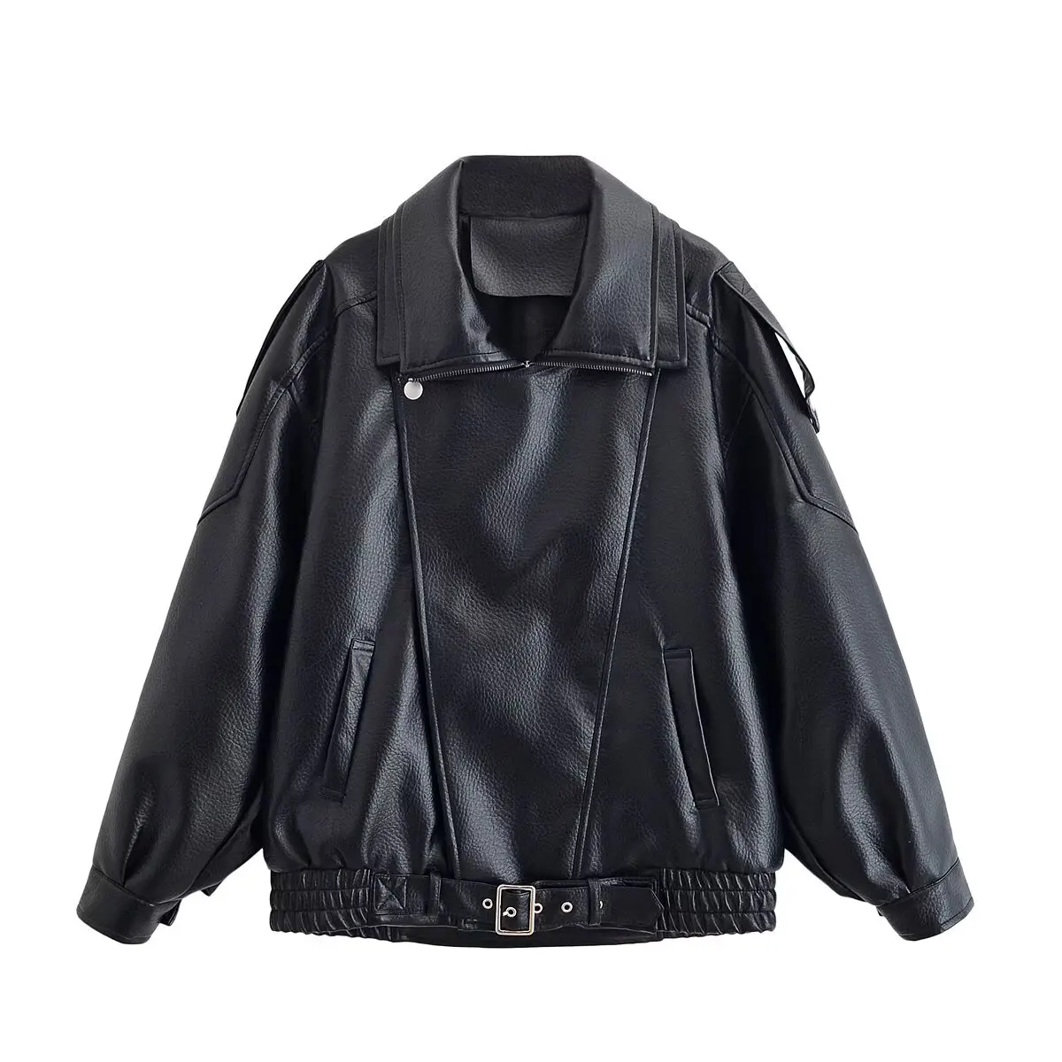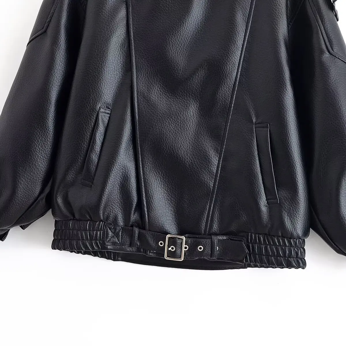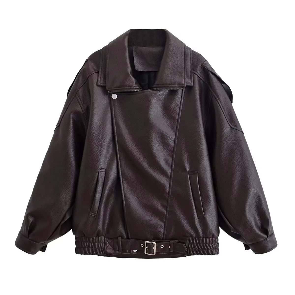 HH Woman Elegant Winter Long Sleeves Zipper Pocket Decoration Quilted Leather Jacket Female Street Style Leisure Lapel Overcoat