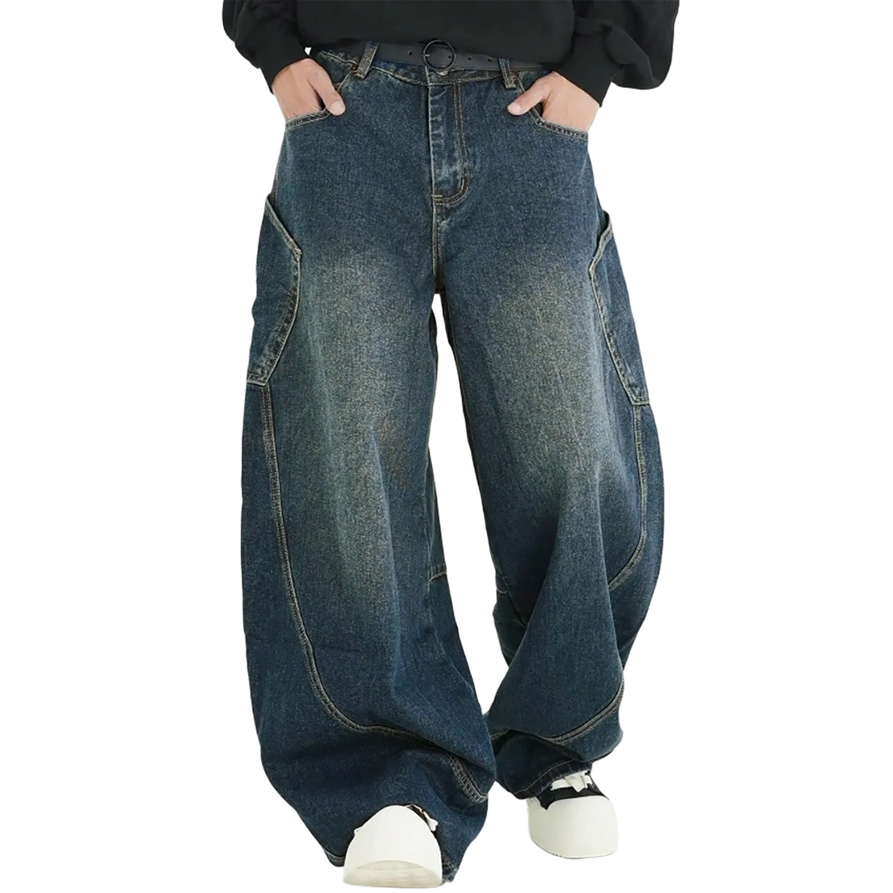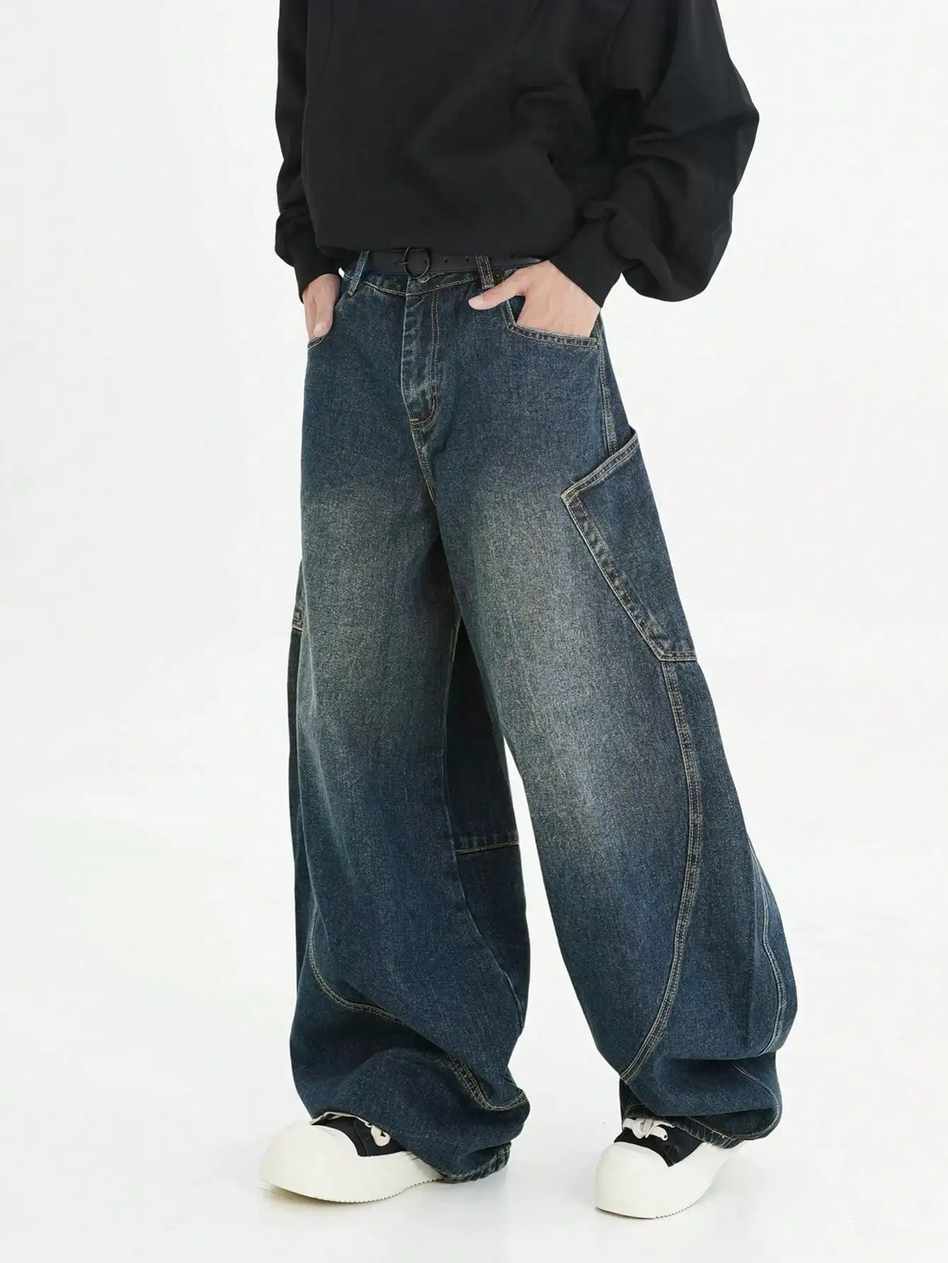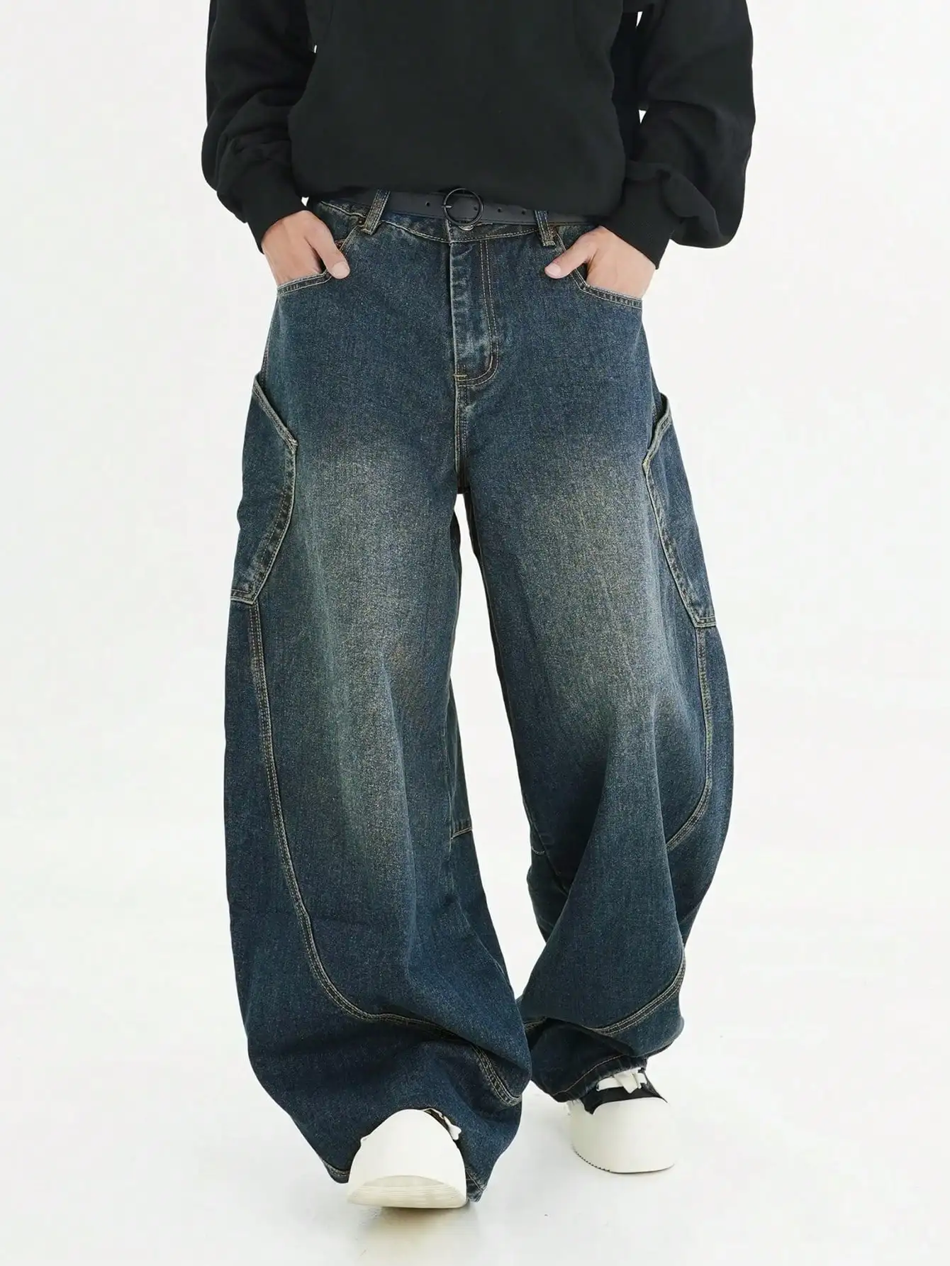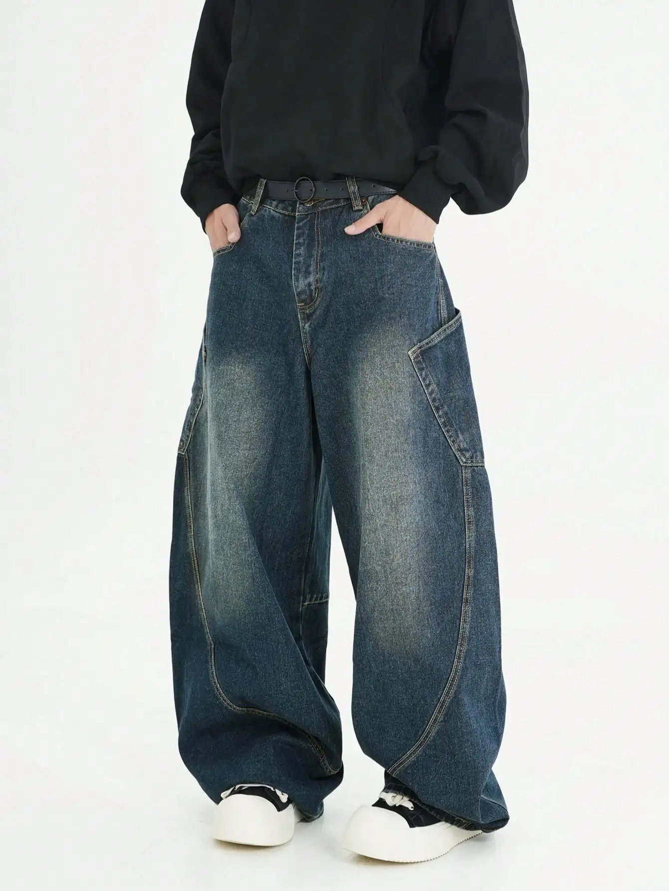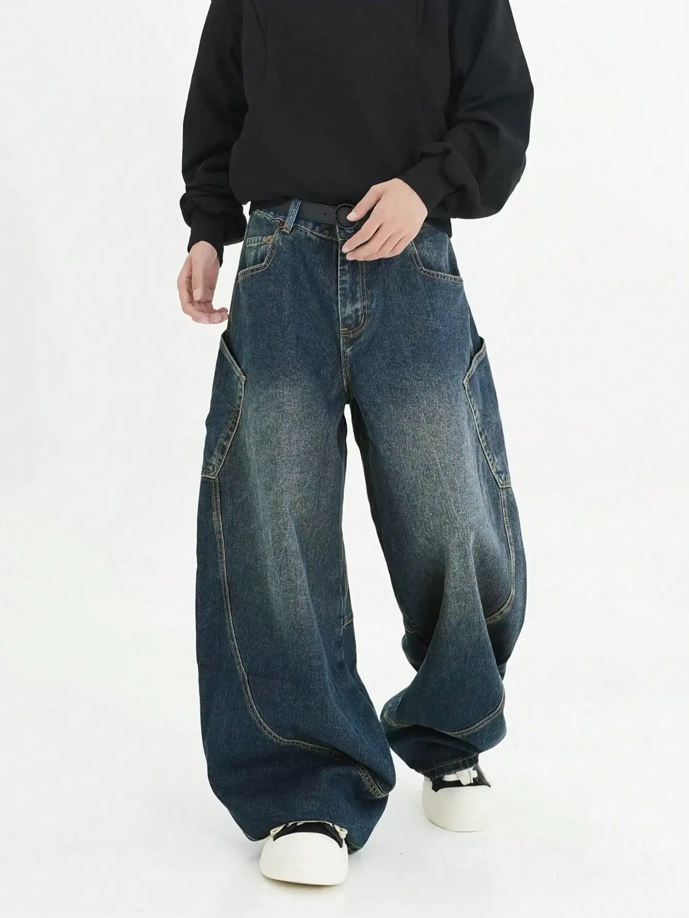 Men's Wear American Washed Denim Pants Vintage Threedimensional Large Pockets Cut Curved Knife Jeans Loose Fit Summer New Trend
