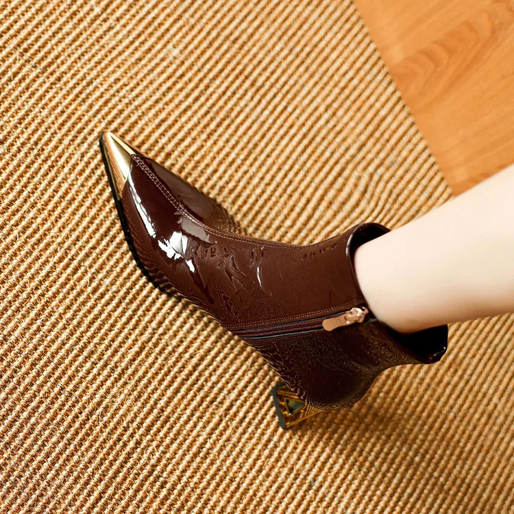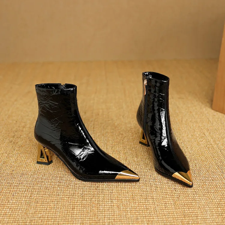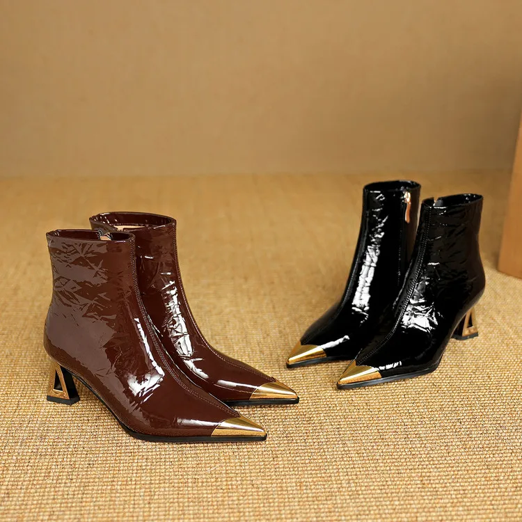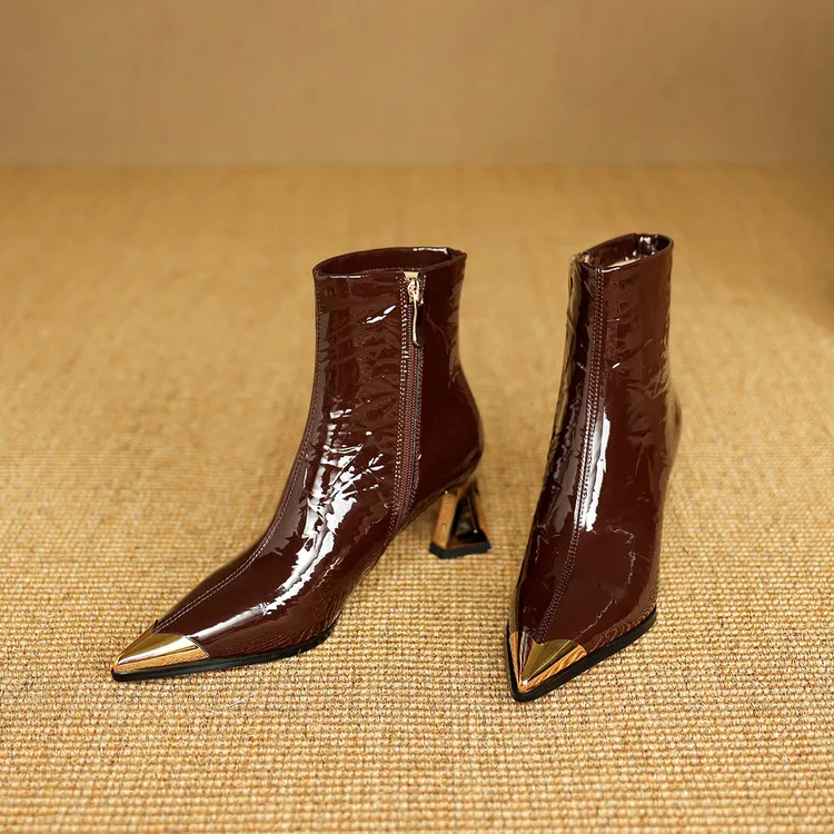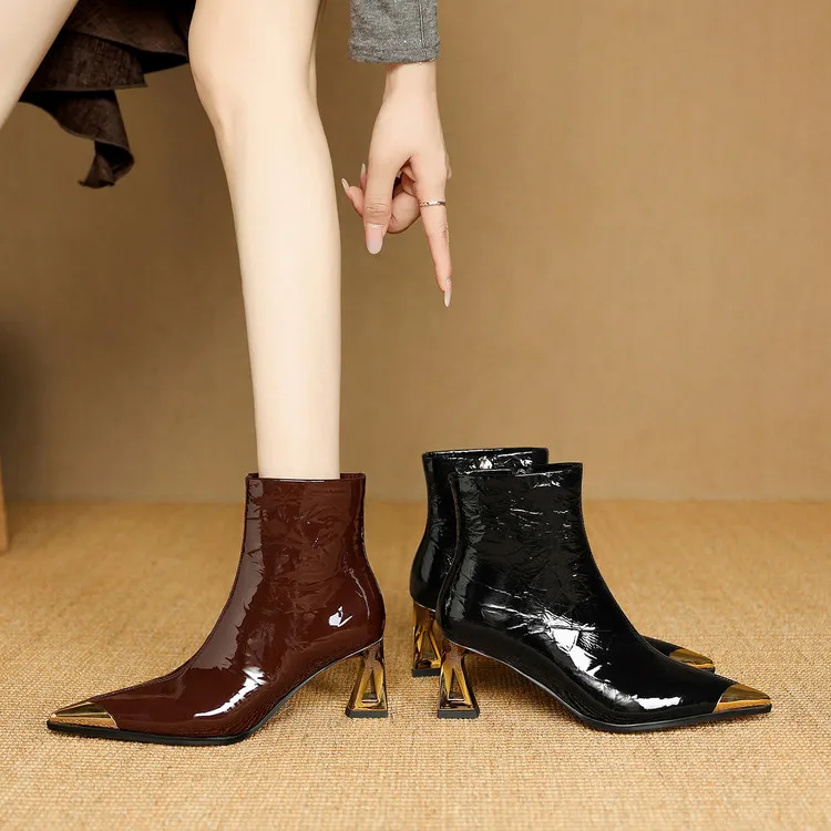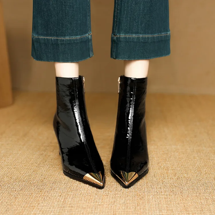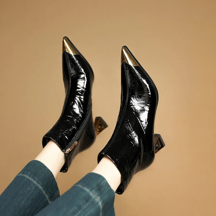 NEW Autumn/Winter Women Boots Patent Leather Shoes for Women Pointed Toe Kitten Heel Shoes Zip Ankle Boots Concise Modern Boots