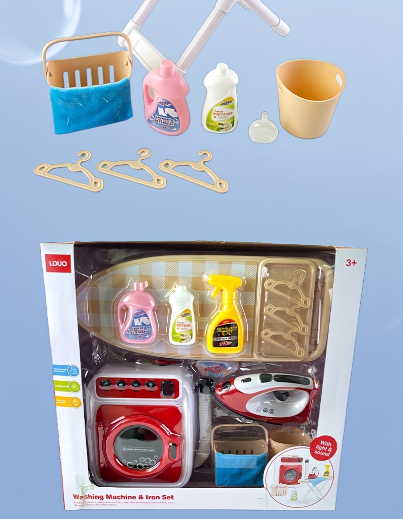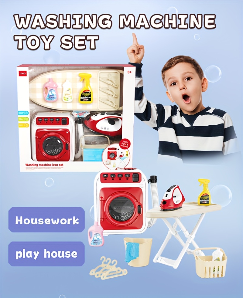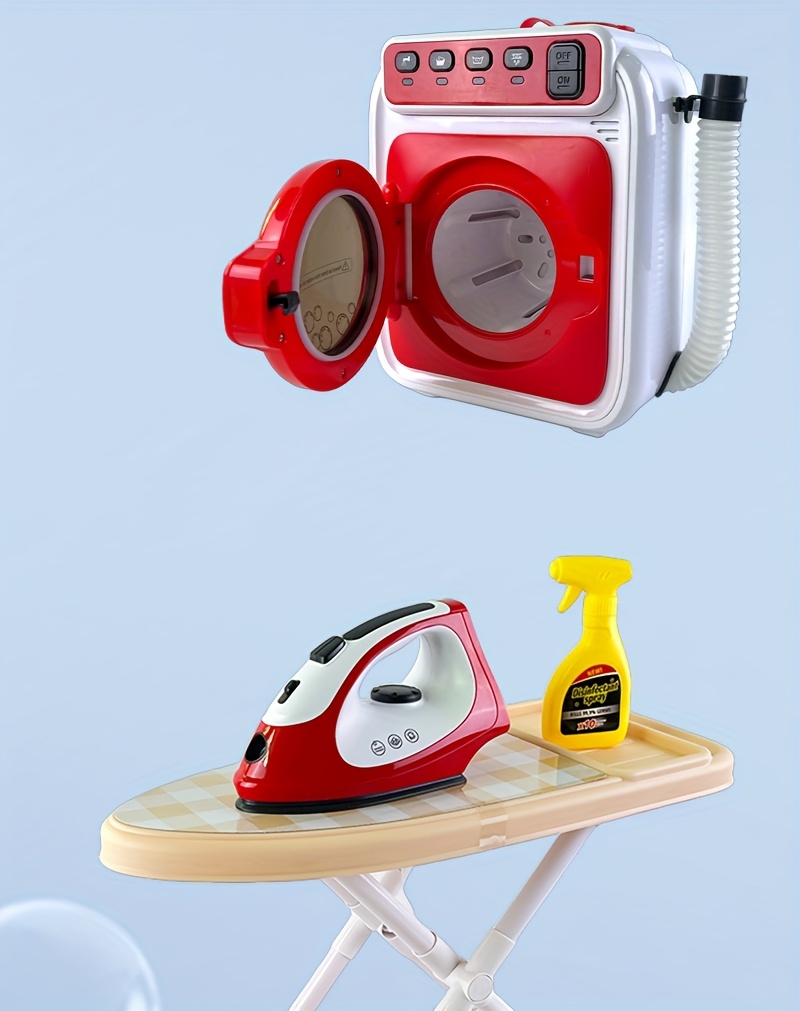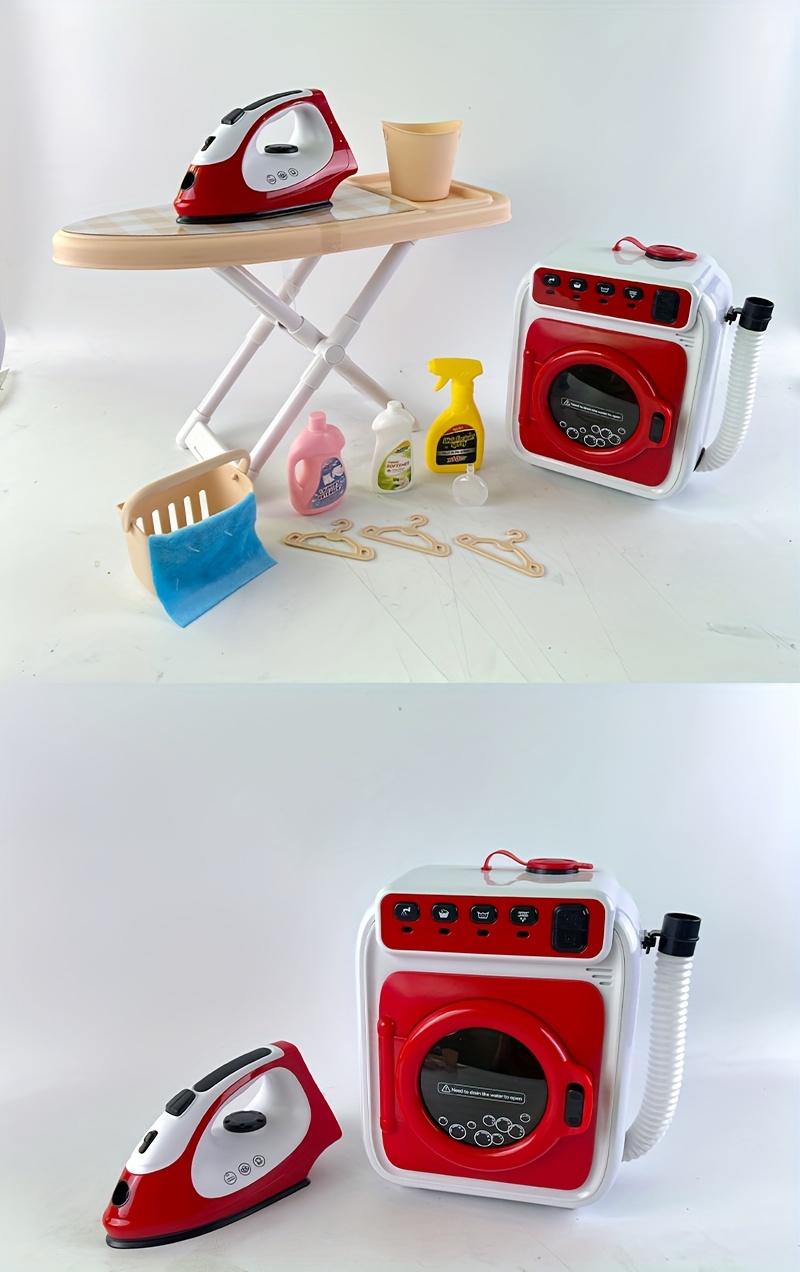Realistic Kids' Pretend Play Laundry Set with Washing Machine, Iron, Ironing Board, Detergent Bottle, Hangers, Cloth & Storage Bin - Red, Realistic Lights & Sounds - Educational Role Play Toy for Ages 3+