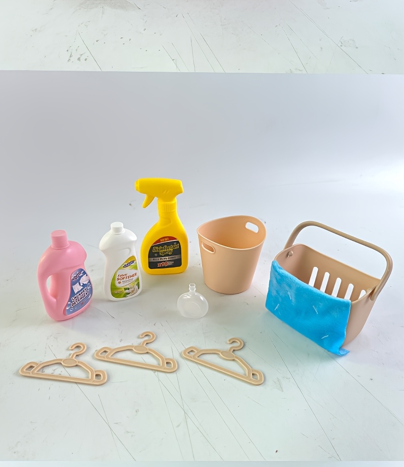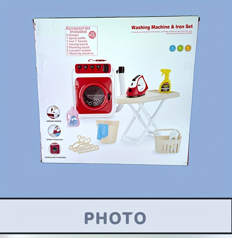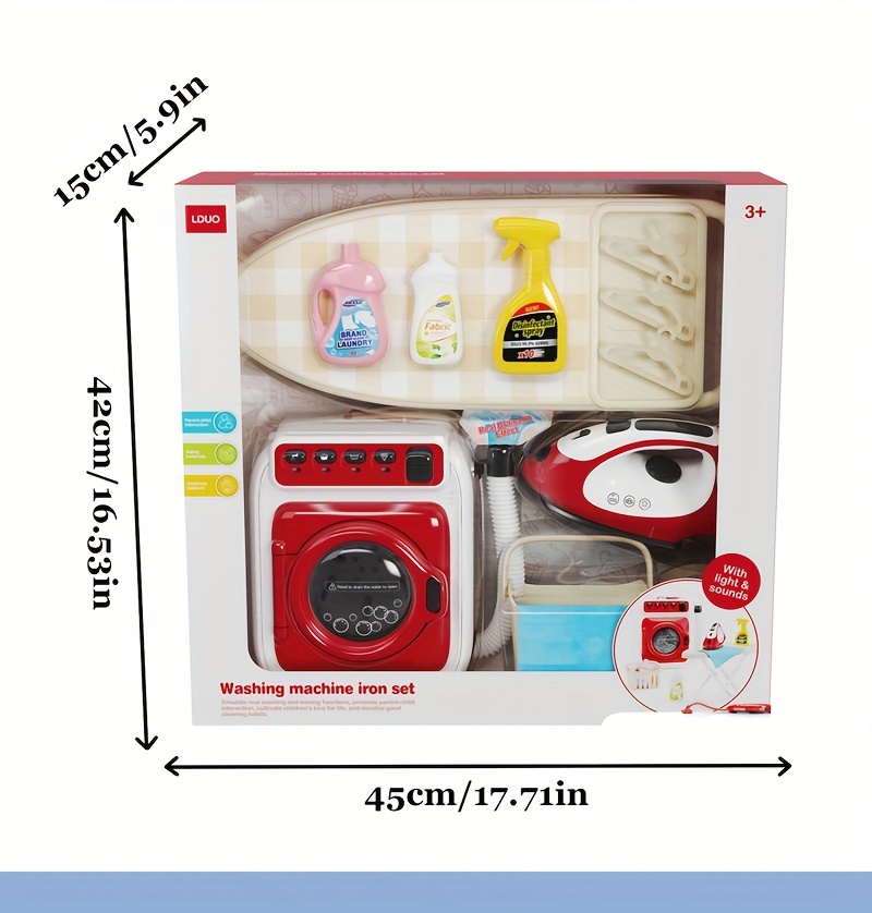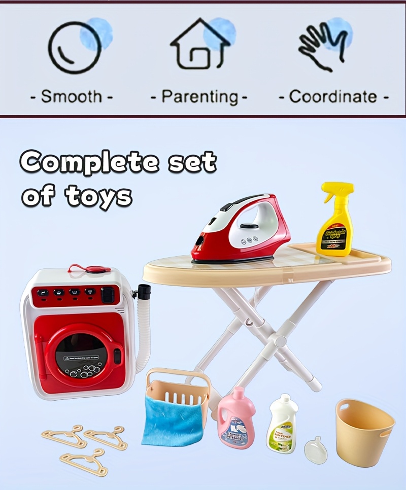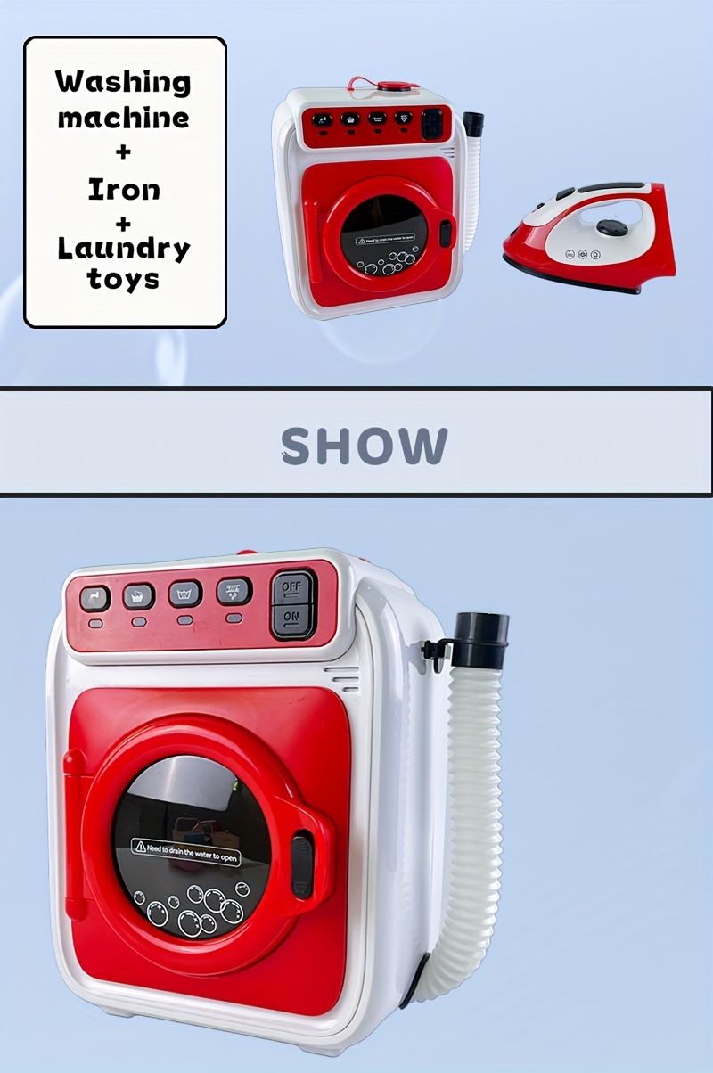 Realistic Kids' Pretend Play Laundry Set with Washing Machine, Iron, Ironing Board, Detergent Bottle, Hangers, Cloth & Storage Bin - Red, Realistic Lights & Sounds - Educational Role Play Toy for Ages 3+