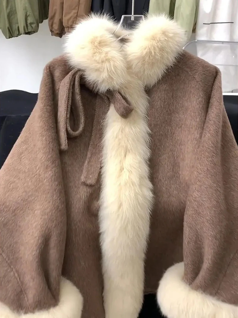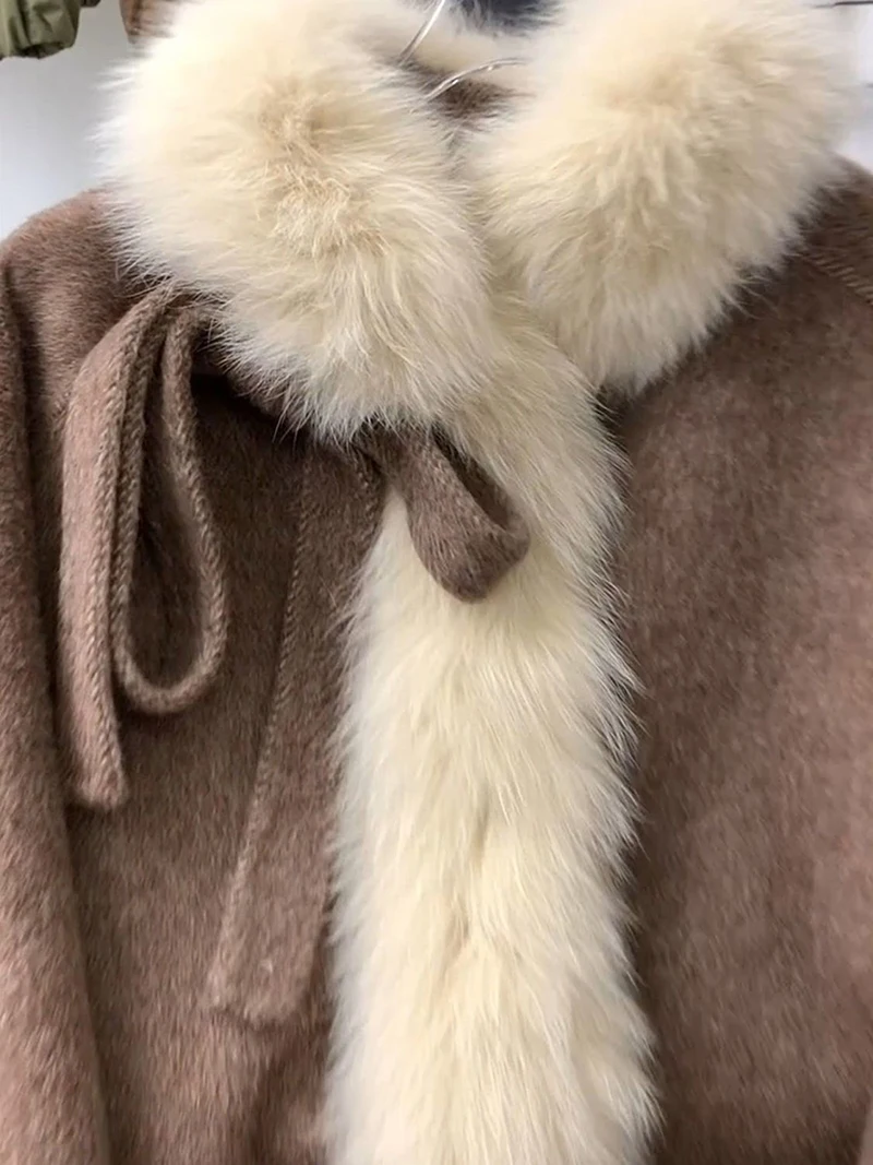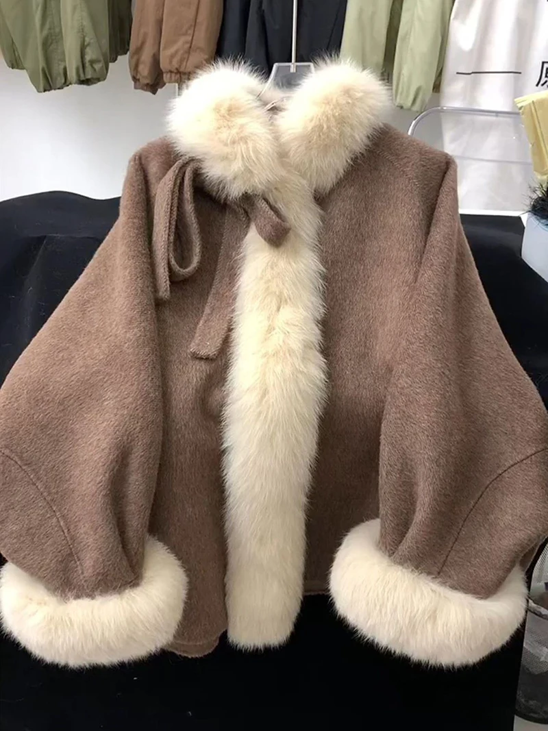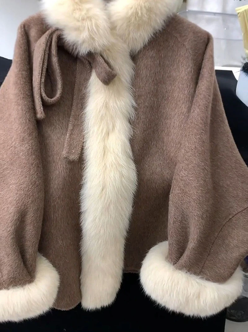 Women Bow Woolen Coats Thick Warm Long Sleeve Fur Collar Patchwork Casual Outwear Preppy Sweet Simple Office Lady Female Tops